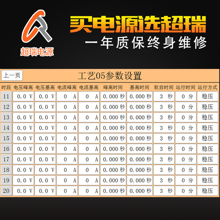 3. 每套工藝程序包含20個時間階段,每個時間階段的脈沖峰高電壓、脈沖基高電壓、脈沖峰高電流、脈沖基高電流、脈沖峰高時間、脈沖基高時間、軟啟動時間、運行時間、運行方式可根據實際生產工藝的要求通過觸摸屏進行設置,參數設置完成后會自動保存,在下次使用時無需再重新設置。